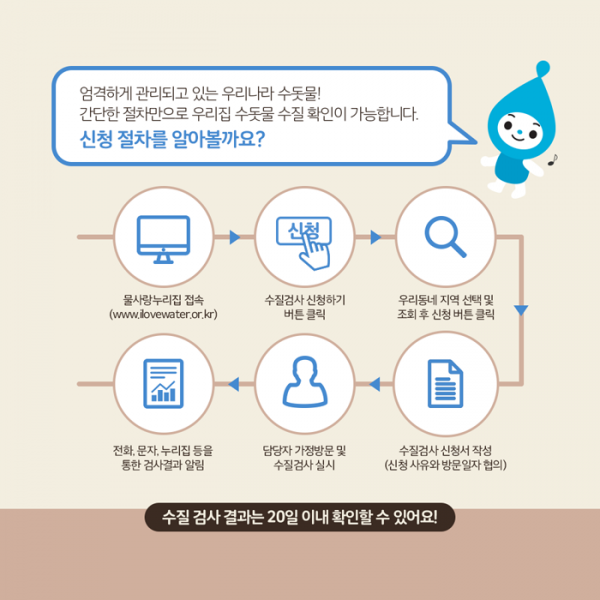 수질검사를 희망하는 군민은 물사랑누리집 또는 전화로 신청하면 언제든지 검사를 받을 수 있다.