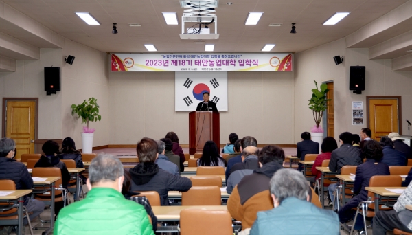 [충청뉴스큐] 태안군이 지난 3일 군 농업기술센터 대강당에서 가세로 군수를 비롯해 교육생과 군민 등 80여명이 참석한 가운데 ‘2023년 제18기 태안농업대학 입학식’을 개최했다.