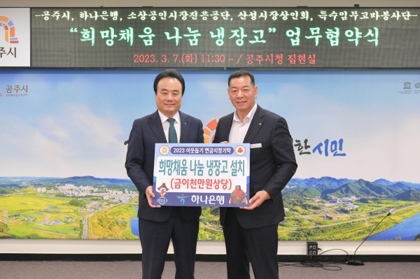 [충청뉴스큐] 공주시는 지난 7일 시청 집현실에서 하나은행 충청영업그룹과 민관 협력 나눔 냉장고 설치 및 운영에 대한 업무협약을 가졌다고 밝혔다.