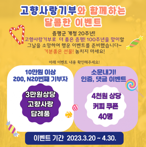 [충청뉴스큐] 증평군이 다음달 30일까지 군 개청 20주년 기념 고향사랑기부 이벤트를 연다.