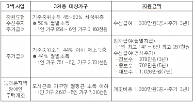 강원도가 차상위계층을 대상으로 올해 처음 시행하는 “강원도형 수선유지 주거급여” 지원사업은 차상위계층 중 고령자, 장애인, 소년소녀가장 등의 임차주택 및 자가주택 100가구를 대상으로 1가구당 300만원 범위 내에서 집수리를 지원하는 것이며, “주거급여” 사업은 차상위계층 보다도 소득이 더 낮은 계층을 대상으로 총44,490가구에 681억원을 지원하는 사업이며, 2018년 10월부터 부양의무자 기준이 폐지되고 2019년부터는 지원대상이 확대되면서 도에서는 그간 부양가족이 있어 혜택을 받지 못했던 고령자 등을 대상으로 방문 등 홍보를 더욱 전개할 계획이다.