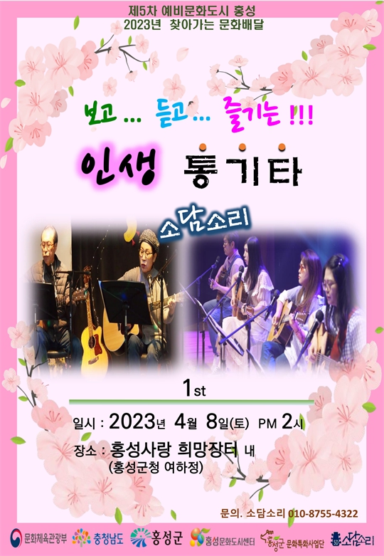 [충청뉴스큐] 홍성군 문화특화사업단‘2023년 찾아가는 문화배달’사업에 선정된 소담소리의‘보고 듣고 즐기는 인생 통기타’공연이 오는 4월 8일 오후 2시부터 홍성사랑 희망장터가 열리는 여하정 상설무대에서 개최된다.