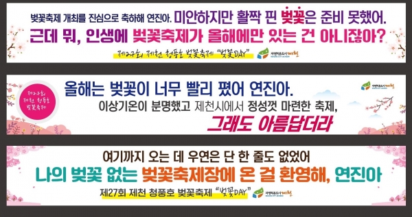 벚꽃사진을 활용한 포토존을 설치하고 아쉬움이 담긴 메시지를 담은 벚꽃 모형을 축제장 주변에 부착한다.
