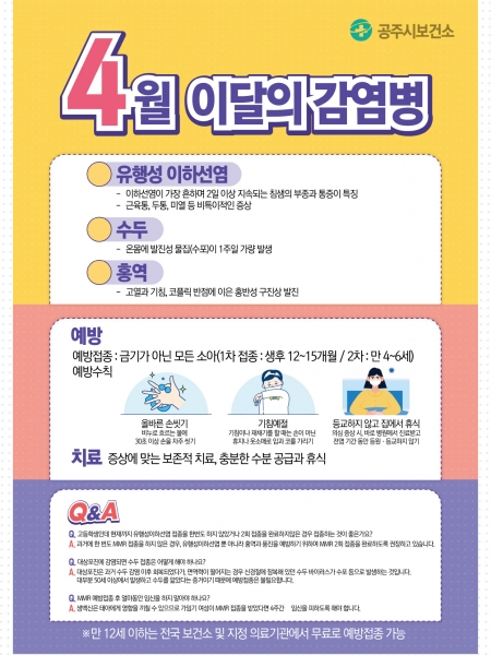 4월 선정 감염병은 바이러스에 의한 급성 감염병 질환인 유행성이하선염, 수두, 홍역으로 올바른 손씻기 기침예절 지키기 예방접종 완료하기 등으로 예방할 수 있다고 밝혔다.