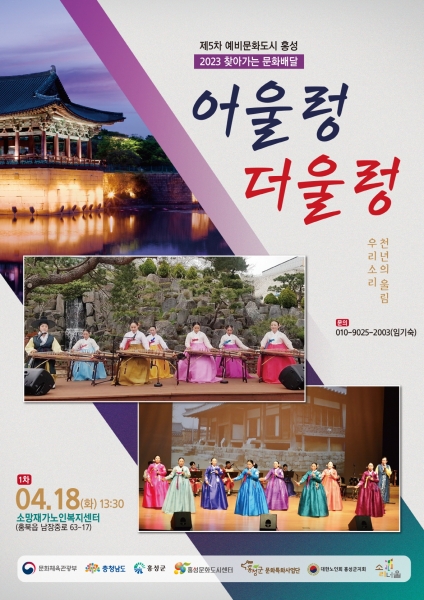 [충청뉴스큐] 홍성군 문화특화사업단의‘2023년 찾아가는 문화배달’지원사업에 선정된 사단법인 소리너울 예술단의‘어울렁 더울렁’공연이 4월 18일 화요일 오후 1시 30분 소망재가노인복지센터에서 개최된다.