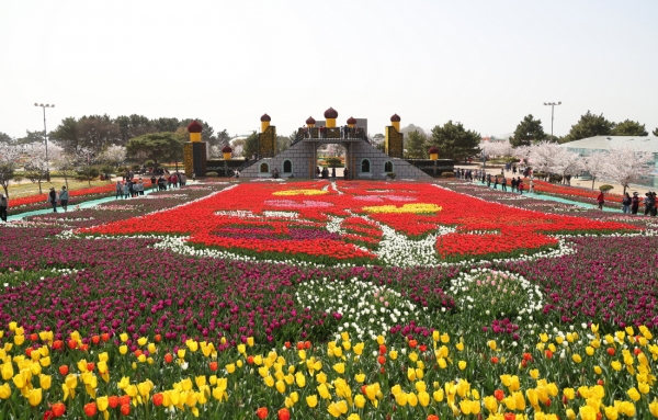 대지에 펼쳐진 카펫 문양의 튤립정원이 지난해에 이어 올해도 조성돼 이색적인 볼거리를 제공하며 나무와 하트 등 갖가지 조형물들이 곳곳에 있어 어디서나 인생사진을 남길 수 있다.