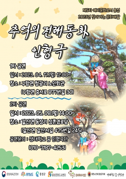 [충청뉴스큐] 홍성문화도시센터의‘2023년 찾아가는 문화배달’지원사업에 선정된‘생태학교 꿈 인형극단’의 공연이 오는 4월 17일 오후 1시에 청광리 경로당에서 개최된다.