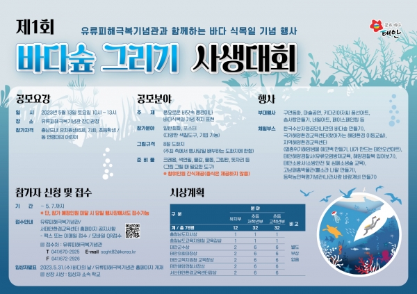 군은 5월 13일 오전 10시 유류피해극복기념관 잔디광장에서 도내 유치원생 및 초등학생을 대상으로 ‘제1회 바다숲 그리기 사생대회’를 개최키로 하고 5월 7일까지 참가 신청을 받는다고 밝혔다.