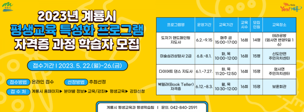 [충청뉴스큐] 계룡시가 22일부터 오는 27일까지 5일간 ‘2023년 평생교육 특성화 프로그램 자격증 과정’ 학습자를 모집한다고 밝혔다.