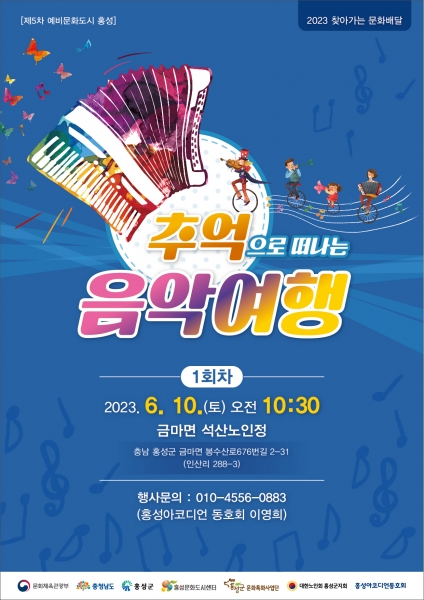 [충청뉴스큐] 홍성문화도시센터의 ‘2023년 찾아가는 문화배달’지원사업에 선정된 홍성 아코디언 동호회의 ‘추억으로 떠나는 음악여행’공연이 6월 10일 오전 10시 30분에 금마면 석산 노인정에서 개최된다.