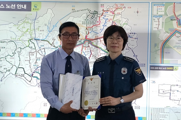 [충청뉴스큐] 홍성군민의 발 홍주여객자동차의 버스기사 윤명호씨가 지난 6월 5일 구자면 홍성경찰서장에게 감사장을 받았다.