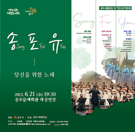 [충청뉴스큐] 공주시는 공주시립합창단 제15회 정기연주회 ‘송 포 유 - 당신을 위한 노래’가 오는 21일 수요일 저녁 7시 30분 공주문예회관 대공연장에서 열린다고 12일 밝혔다.