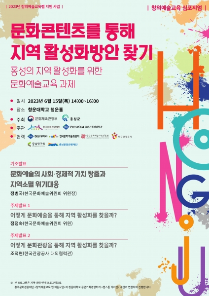 ‘창의예술교육 심포지엄’은 홍주문화관광재단에서 문화체육관광부 국비지원사업으로 선정된‘2023년 창의예술교육랩 지원사업’과 청운대학교 공연기획경영학과의 ‘캡스톤 디자인과정’이 연계해 진행된다.