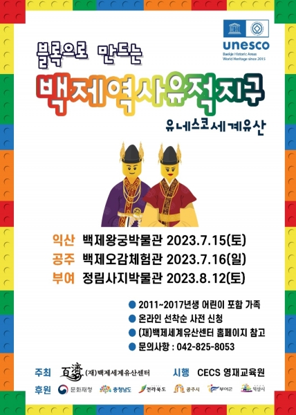 ‘블록으로 만드는 백제역사유적지구’프로그램은 세계유산축전 기간인 7월 15일 익산 백제왕궁박물관, 7월 16일 공주 백제오감체험관에서 운영되며 부여는 문화재 야행 기간인 8월 12일에 정림사지박물관에서 각각 진행될 예정이다.