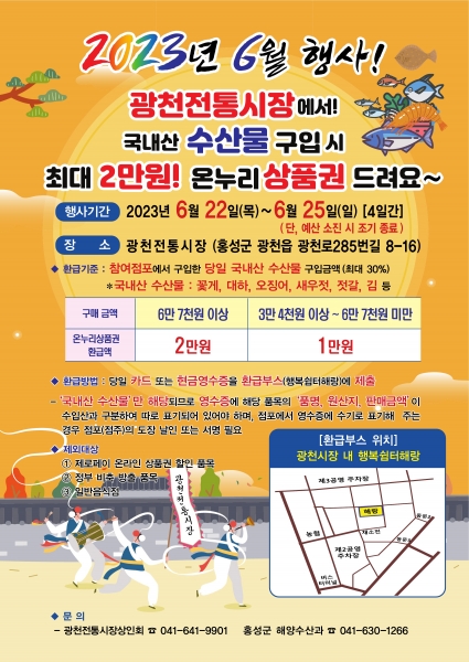행사는 오는 6월 22일부터 25일까지 4일간 광천전통시장에서 시행되며 행사참여점포에서 당일 국내산 수산물을 구입하면 최대 30%까지 온누리상품권으로 환급해주는 방식으로 진행된다.
