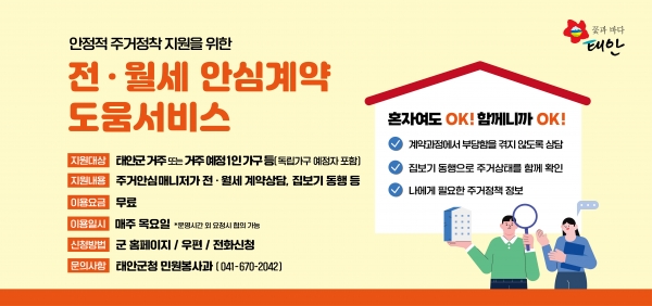 [충청뉴스큐] 태안군이 1인 가구 등의 안정적인 주거정착을 위해 다음달부터 ‘전·월세 안심계약 도움 서비스’를 도입한다.