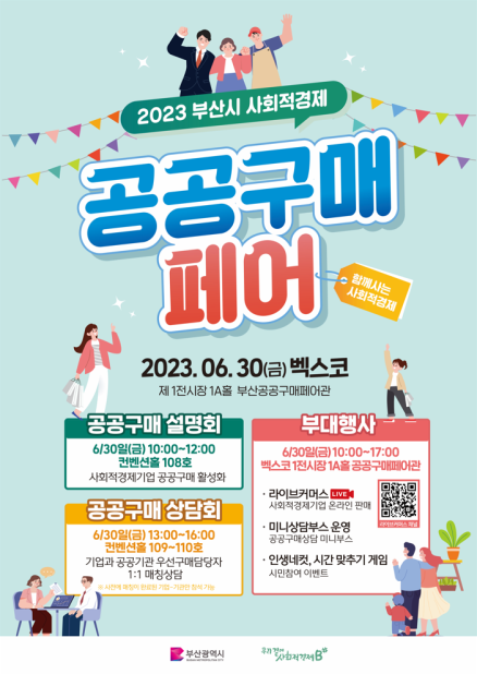 [충청뉴스큐] 부산시는 오는 6월 30일 벡스코에서 지역 경제난으로 어려움을 겪고 있는 부산지역 사회적경제기업의 판로를 확대하고 사회적경제기업 제품에 대한 공공기관의 공공구매 필요성 인식을 널리 공유하고자 ‘2023 부산 사회적경제 공공구매 페어’를 개최한다고 밝혔다.