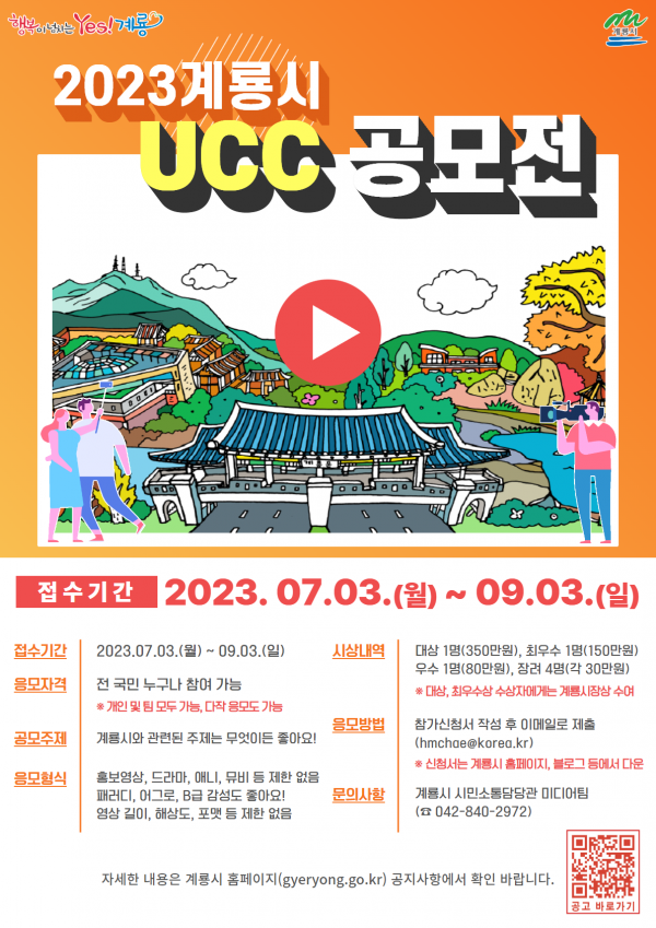 [충청뉴스큐] 계룡시는 전국민을 대상으로 ‘2023 계룡시 UCC 영상 공모전’을 개최한다고 밝혔다.