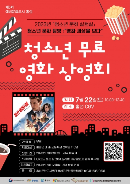 관람료는 무료이며 지원대상은 홍성군 내 중·고등학생 선착순 110명이고 신청기간은 7월 8일부터 QR코드 또는 홈페이지를 통해 접수를 받으며 영화는 미션임파서블 7을 관람한다.