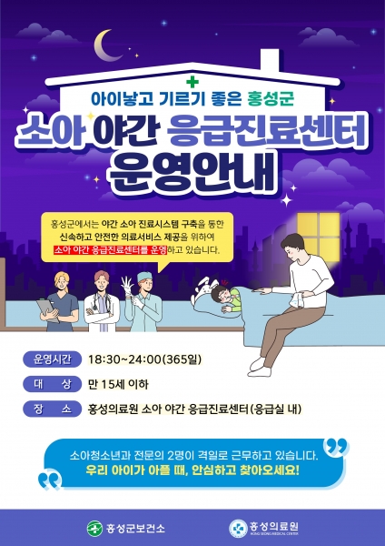 소아 야간 응급진료센터는 홍성의료원 응급실 내에 설치되어 오후 6시 30분부터 24시까지 연중 운영하고 있으며 소아 응급환자가 안심하고 진료를 받을 수 있도록 소아청소년과 전문의 2명이 교대로 근무하고 있다.