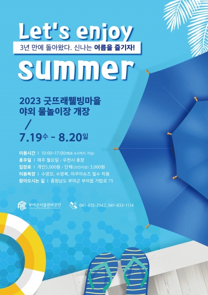 [충청뉴스큐] 부여군이 한여름 무더위를 식혀줄 굿뜨래웰빙마을 야외 물놀이장을 오는 7월 19일부터 8월 20일까지 한 달간 운영한다.