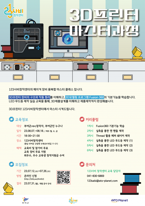 특히 123사비창작 센터에서 자체적으로 보유하고 있는 3D프린터 장비를 활용해 교육생들이 직접 시제품을 만들어볼 수 있도록 할 예정이다.