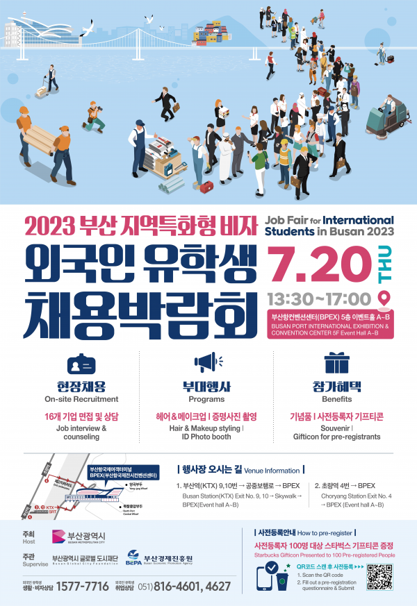 이번 박람회는 부산시가 주최하고 부산글로벌도시재단과 부산경제진흥원이 공동으로 주관하며 부산출입국·외국인청이 후원기관으로 참여한다.
