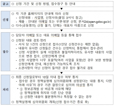 국민신청실명제는 행정기관이 수립·시행하는 주요 정책에 참여한 관련자의 실명과 의견을 관리하고 공개하는 정책실명제를 강화하기 위해 국민이 원하는 사업이 공개될 수 있도록 국민의 참여를 보장하는 제도이다.