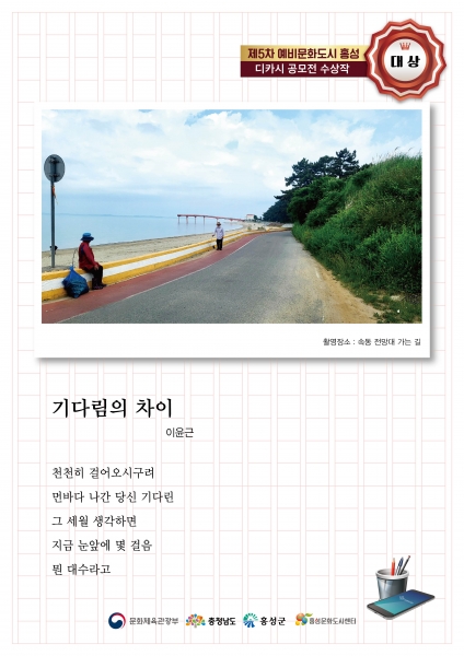올해 영예의 대상은 경기 군포시에 거주하는 이윤근씨의 기다림의 차이가 차지했으며 작품은 삶의 깊은 배려를 잔잔한 서해안의 해안선과 둥근 길로 시적으로 절묘하게 표현해 심사위원의 만장일치로 선정됐다.