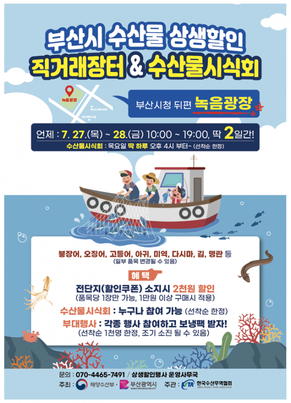 부산시는 오는 27일과 28일 오전 10시부터 오후 7시까지 시청 녹음광장에서 ‘수산물 상생할인 직거래장터’를 개최한다고 밝혔다.