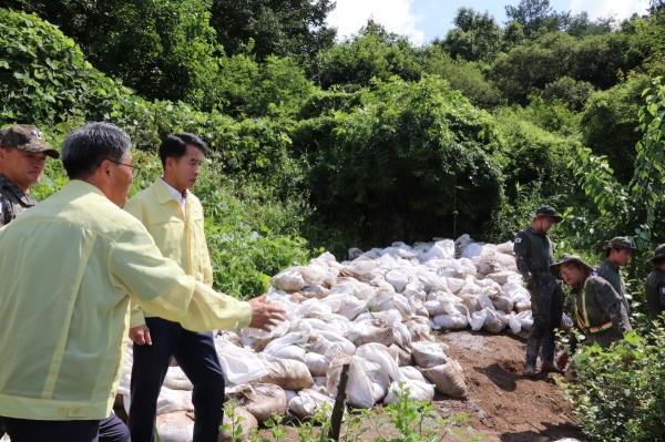 지난 25일 회남면 거교리 주택 사면, 유실 지역 등 응급 복구 현장에 최재형 군수와 제37사단 박성제 사단장이 직접 방문해 복구 상황 점검과 군 장병들을 격려했다.