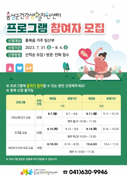 [충청뉴스큐] 홍성군 건강생활지원센터가 오는 31일부터 8월 4일까지 임산부의 건강관리와 육아 정보 공유를 위한 하반기 프로그램 수강생을 모집한다.