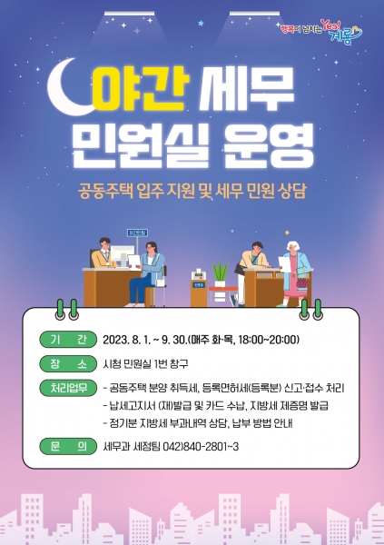 [충청뉴스큐] 계룡시는 공동주택 입주 시작에 따른 세무 민원을 해소하고 업무시간 내 방문이 어려운 시민들에게 맞춤형 서비스를 제공하기 위한 야간 세무민원실 운영에 나선다고 밝혔다.