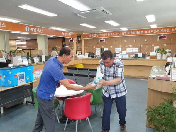 이를 위해 지역사회보장협의체는 신관동에 생수 500개를 후원했으며 신관동은 이를 아이스박스에 담아 민원 업무를 보기 위해 방문하는 지역민들에게 나눠주고 있다.