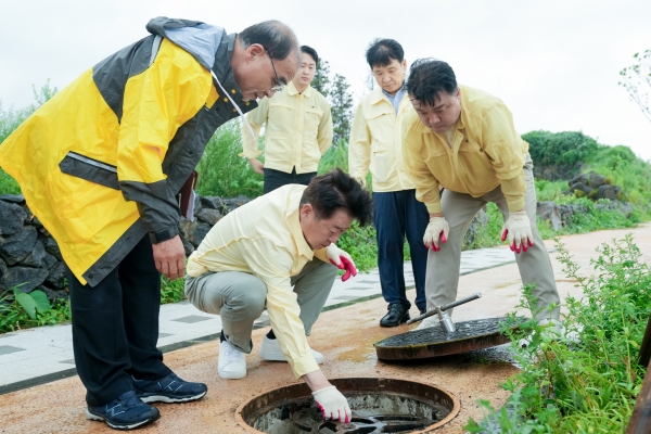 오영훈 지사는 9일 오전 11시 제주시 연북로 부록마을 인근을 찾아 우수맨홀 잠금장치와 추락방지시설을 살펴보고 인명피해 예방에 행정력을 집중할 것을 강조했다.