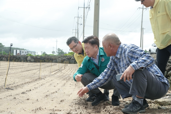 오영훈 지사는 10일 오전 11시 제주시 구좌읍 행원리에 위치한 당근 재배농가와 콩 재배농가를 찾아 태풍 피해상황을 점검하고 농업 관련 유관기관과 협업해 농작물 생육 관리와 피해 복구에 속도를 내겠다고 강조했다.