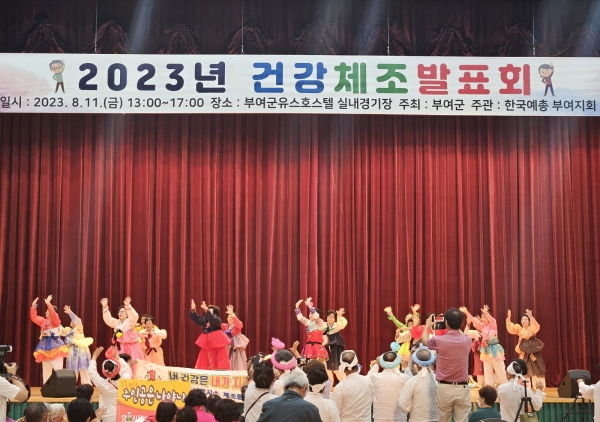 [충청뉴스큐] 부여군은 지난 11일 유스호스텔 실내경기장에서 ‘어르신들의 건강한 삶 행복한 인생’이란 주제로 건강한 생활과 아름다운 노후를 위한 2023년 건강체조발표회를 개최했다.