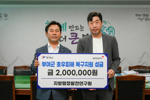 [충청뉴스큐] 충남지방행정발전연구원은 지난 25일 부여군청을 찾아 집중호우 수해복구 성금 2백만원을 기탁했다.