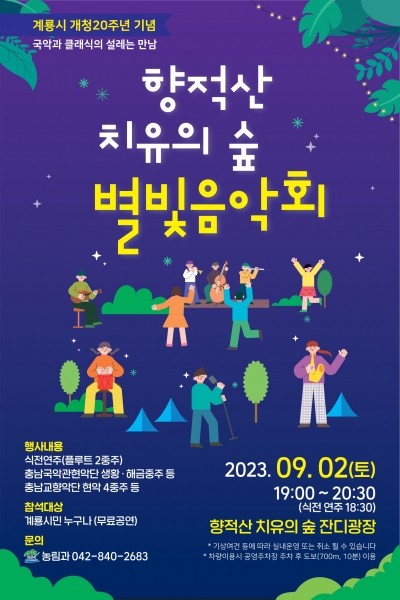 [충청뉴스큐] 계룡시는 오는 9월 2일 향적산 치유의 숲 잔디광장에서 ‘향적산 치유의 숲 별빛음악회’를 개최한다고 밝혔다.