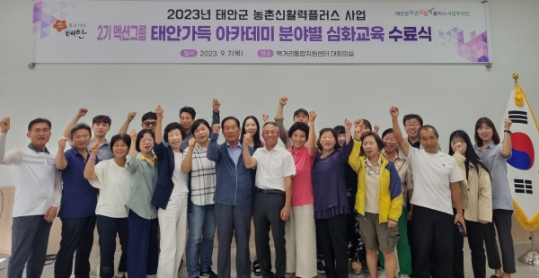 [충청뉴스큐] 태안군이 지난 7일 태안군 먹거리통합지원센터에서 군 관계자와 교육생 등이 참석한 가운데 ‘2023년 태안가득 아카데미 심화교육’ 수료식을 갖고 총 43명의 수료생을 배출했다고 밝혔다.