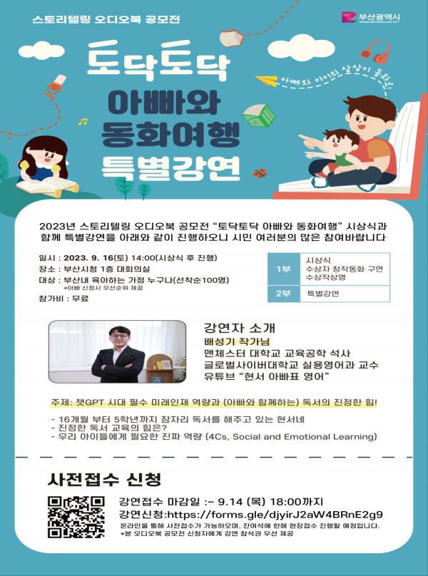 특별강연에는 유튜브 ‘현서 아빠표 영어’로 유명한 배성기 작가를 초청해 아빠와 아이가 소통·교감 할 수 있는 잠자리 독서 독서의 중요성에 대해 이야기를 나눠볼 수 있다.