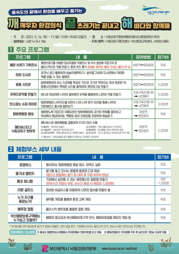[충청뉴스큐] 부산시 낙동강관리본부는 오는 9월 16일부터 17일까지 낙동강하구탐방체험장 일원에서 ‘제2회 가을 환경교육 체험행사’를 개최한다고 밝혔다.