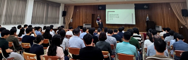 이날 교육은 청주대학교 정진수 교수를 초빙해 공공언어의 의미 및 쉬운 언어의 요건 공문서 정확하고 명료하게 쓰기 보도자료 작성 시 표기 사례 등 누구나 이해하기 쉽고 바른 우리말 사용을 통해 민원인들과의 원활한 의사소통이 이뤄지도록 실무중심적 교육이 이뤄졌다.