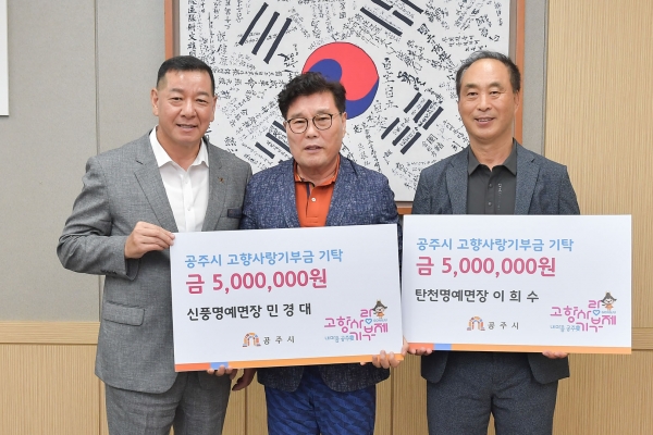 [충청뉴스큐] 공주시는 지난 11일 이희수 명예탄천면장, 정근철 명예사곡면장, 민경대 명예신풍면장이 고향사랑기부금을 기탁했다고 밝혔다.