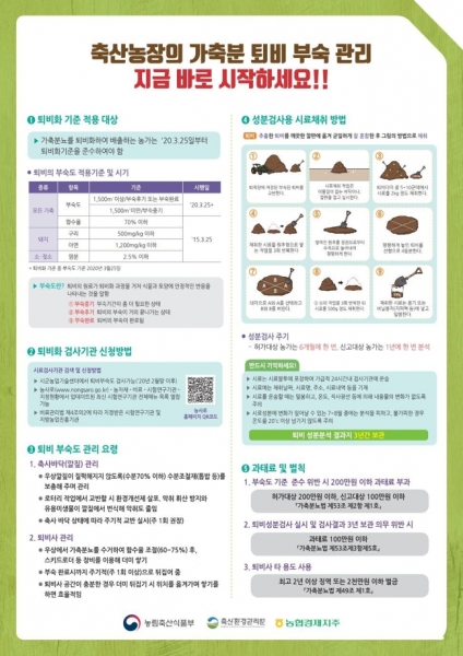 또한, 축사면적이 1,500㎡ 이상이면 퇴비 부숙도 검사에서 부숙후기나 부숙완료 판정을 받아야 퇴비를 뿌릴 수 있다.