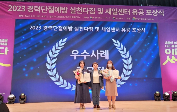 [충청뉴스큐] 공주시는 지난 12일 서울마포중앙도서관에서 개최된 ‘2023년 경력단절예방 선포 및 여성새로일하기센터 유공 포상식’에서 공주여성새로일하기센터가 개인 부문 ‘대상’을 수상했다고 밝혔다.