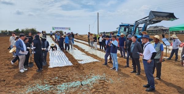 [충청뉴스큐] 제주특별자치도 농업기술원과 농촌진흥청 국립농업과학원은 12일 대정읍 신도리에서 ‘마늘 파종 기계화 재배모델 현장연시회’를 공동 개최했다.
