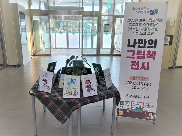 보은군립도서관 1층 로비에는 어르신과 다문화가족이 도서관 프로그램을 통해 직접 글을 쓰고 그림을 그려 출판된 14종의‘나만의 그림책’전시가 함께 진행된다.