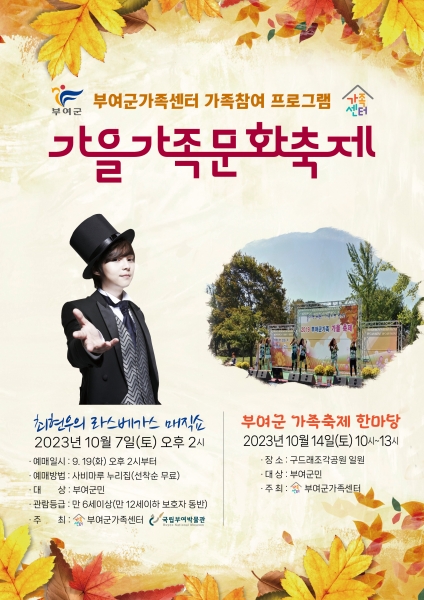 또한 10월 14일 오전 9시 40분부터 오후 1시까지 구드래 조각공원 일원에서 모든 가족들이 다양한 볼거리와 먹거리, 체험 등을 즐길 수 있는 어울림의 장인 “부여군 가족축제 한마당”이 개최 예정이다.