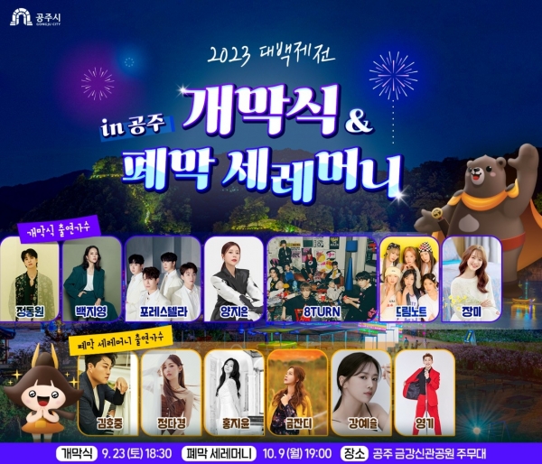 이와 함께 9월 26일 금강신관공원 주무대에서 열리는 KBS 전국노래자랑에는 조항조, 한혜진, 주병선, 황민우, 김추리가 초대 가수로 함께하고 10월 3일에는 박서진, 유지나, DK, 김연지 등이 출연하는 대백제전 성공기원 특별콘서트가 마련된다.
